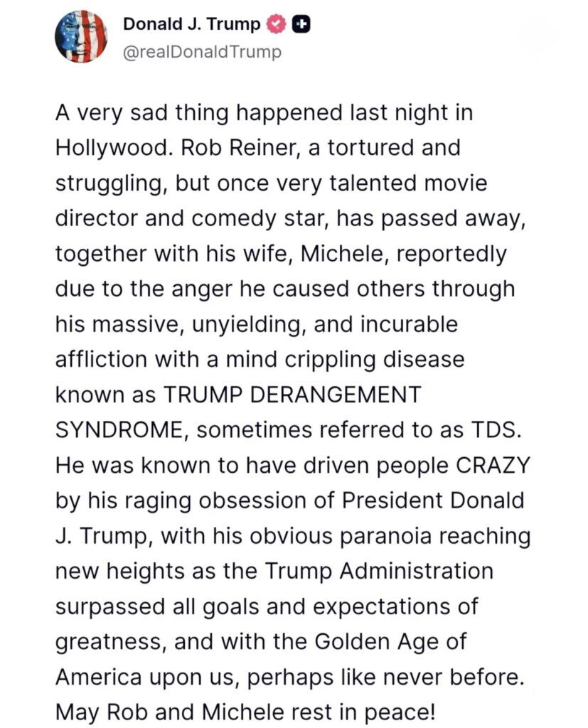 In his post, Trump referred to Reiner’s alleged strong criticism of him, calling it a “massive, unyielding, and incurable affliction” sometimes referred to as “Trump Derangement Syndrome” (TDS). He wrote that Reiner “was known to have driven people crazy by his raging obsession with President Donald J. Trump,” adding that “may Rob and Michele rest in peace.”